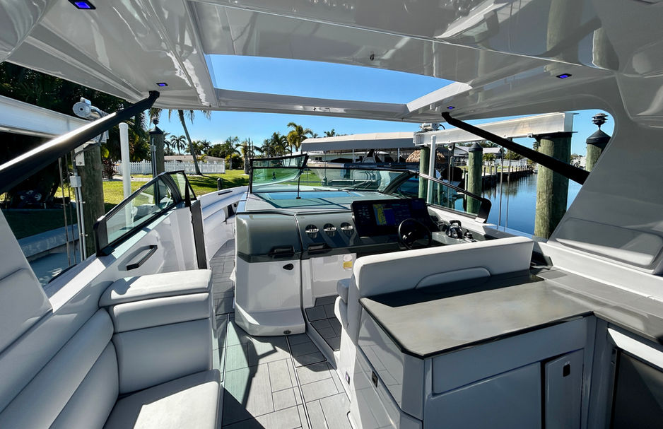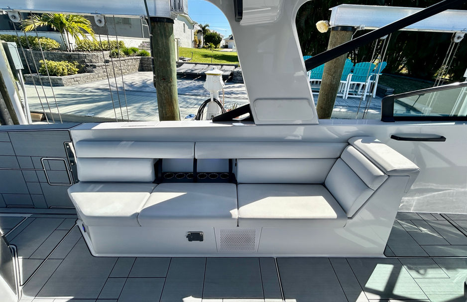 The premium helm is a captain's dream, featuring Two Cooled Cup Holders for chilled drinks at your fingertips, a Radar 4k UHD, and a sophisticated electronics suite with both Garmin and Simrad displays for intuitive navigation, charting, and system monitoring.
